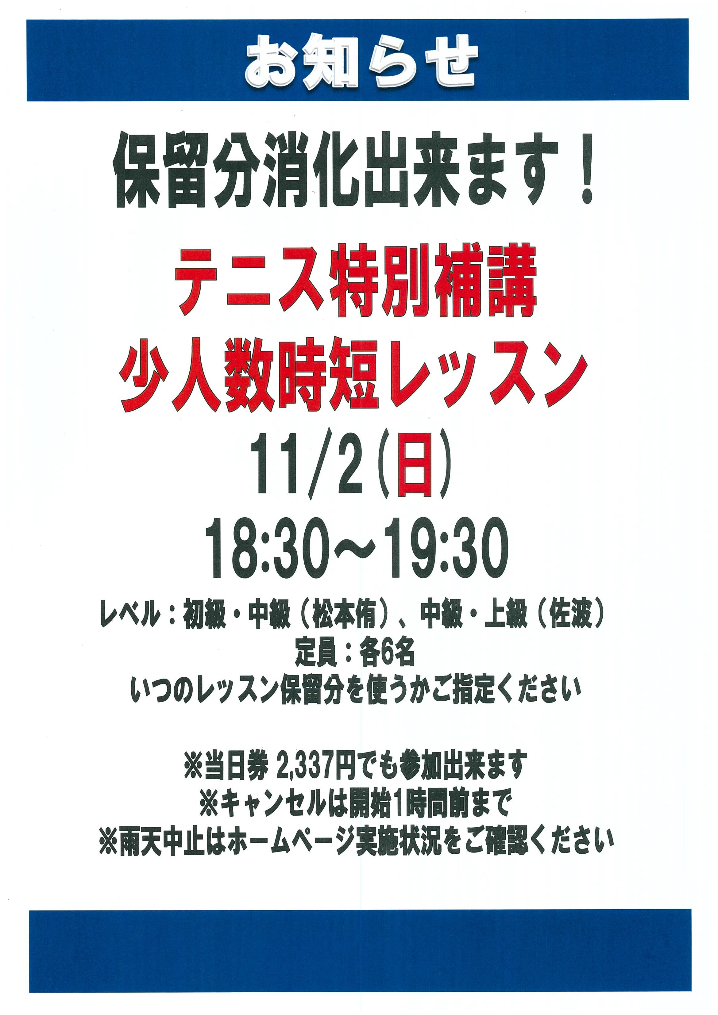 11月 テニス特別補講少人数時短レッスンのお知らせ(初級・中級、中級・上級) ※11/2(日)18:30~19:30