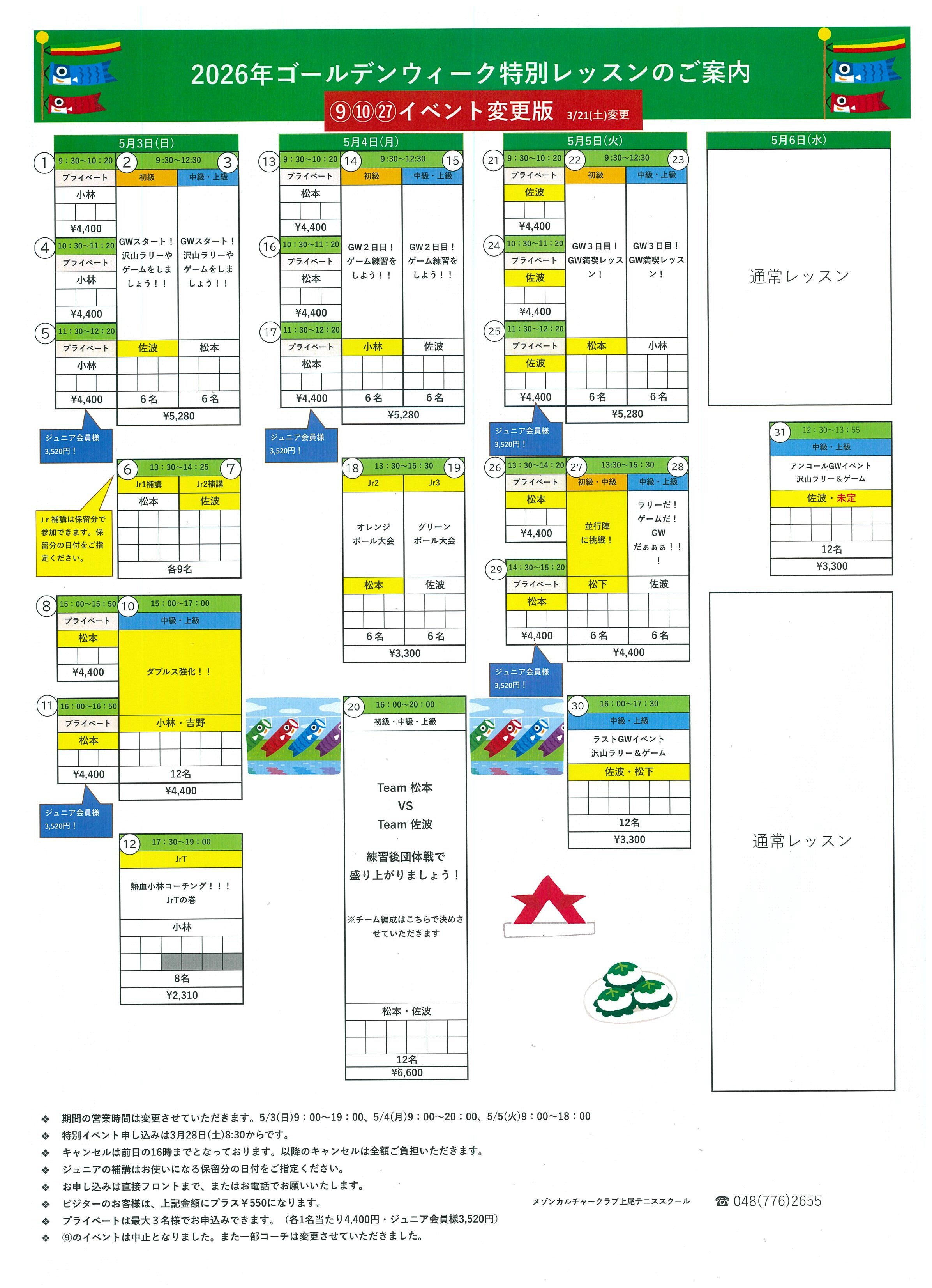 2026年ゴールデンウィーク特別レッスンのご案内(3/21更新版) ※受付開始3/28(土)8:30~