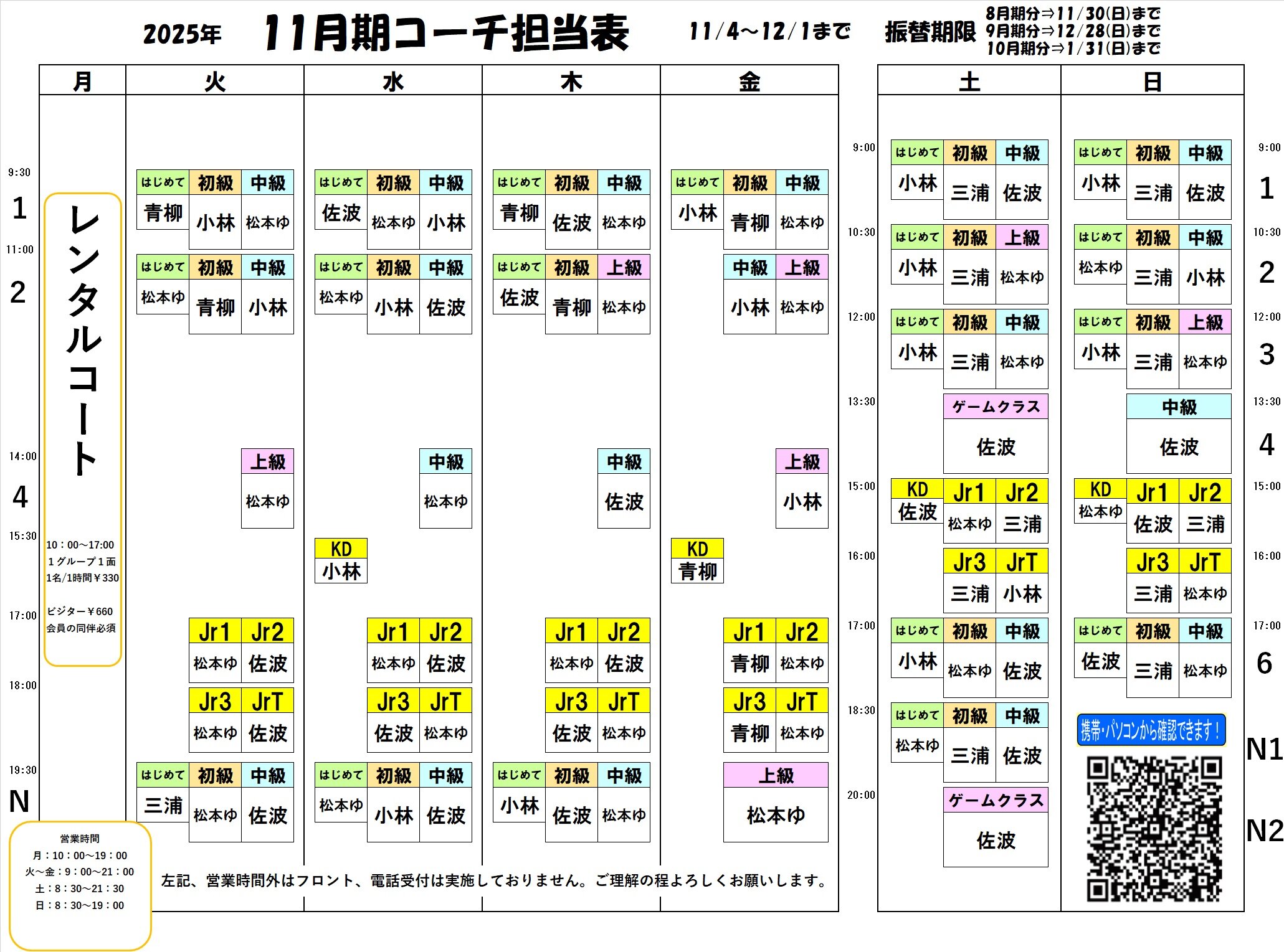 テニス11月 テニス特別補講少人数時短レッスンのお知らせ(初級・中級、中級・上級) ※11/2(日)18:30~19:30