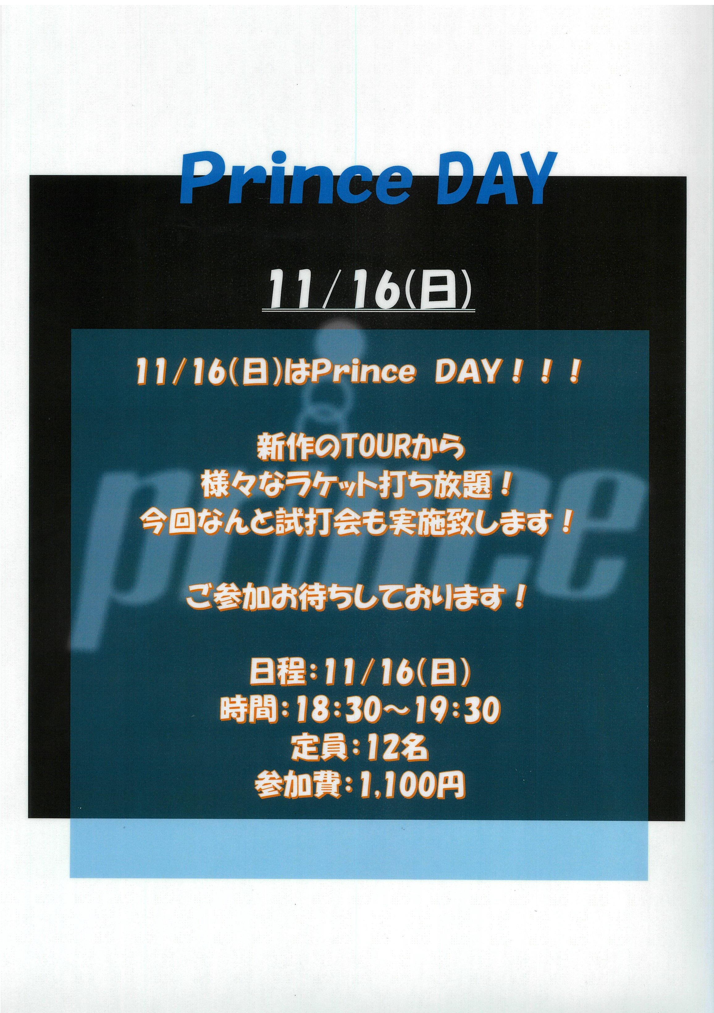 テニス11月イベント プリンスデー試打会のお知らせ 11/16(日)18:30~19:30