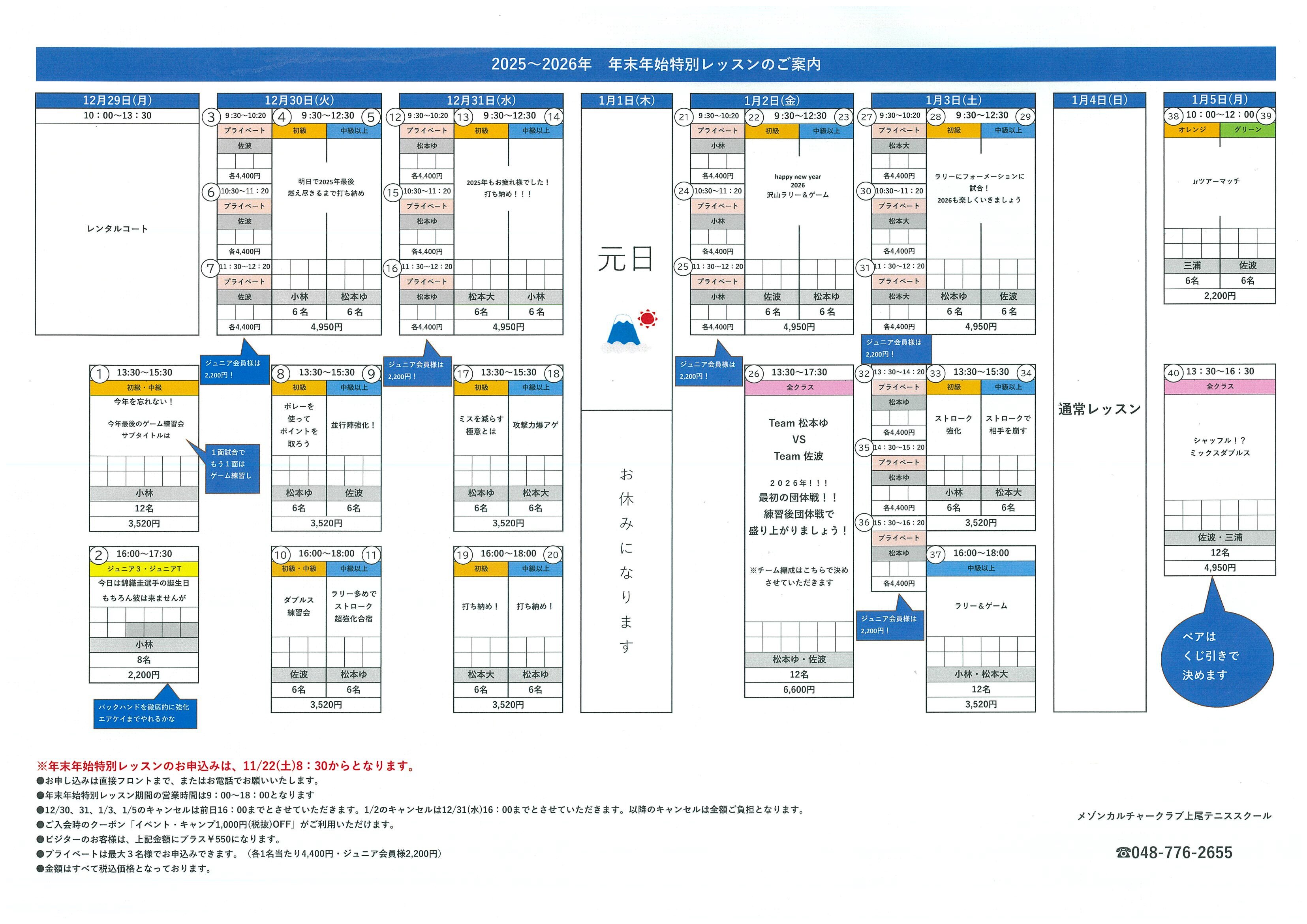 テニス2025年末年始特別レッスンのお知らせ 11/22(土)8:30~受付開始