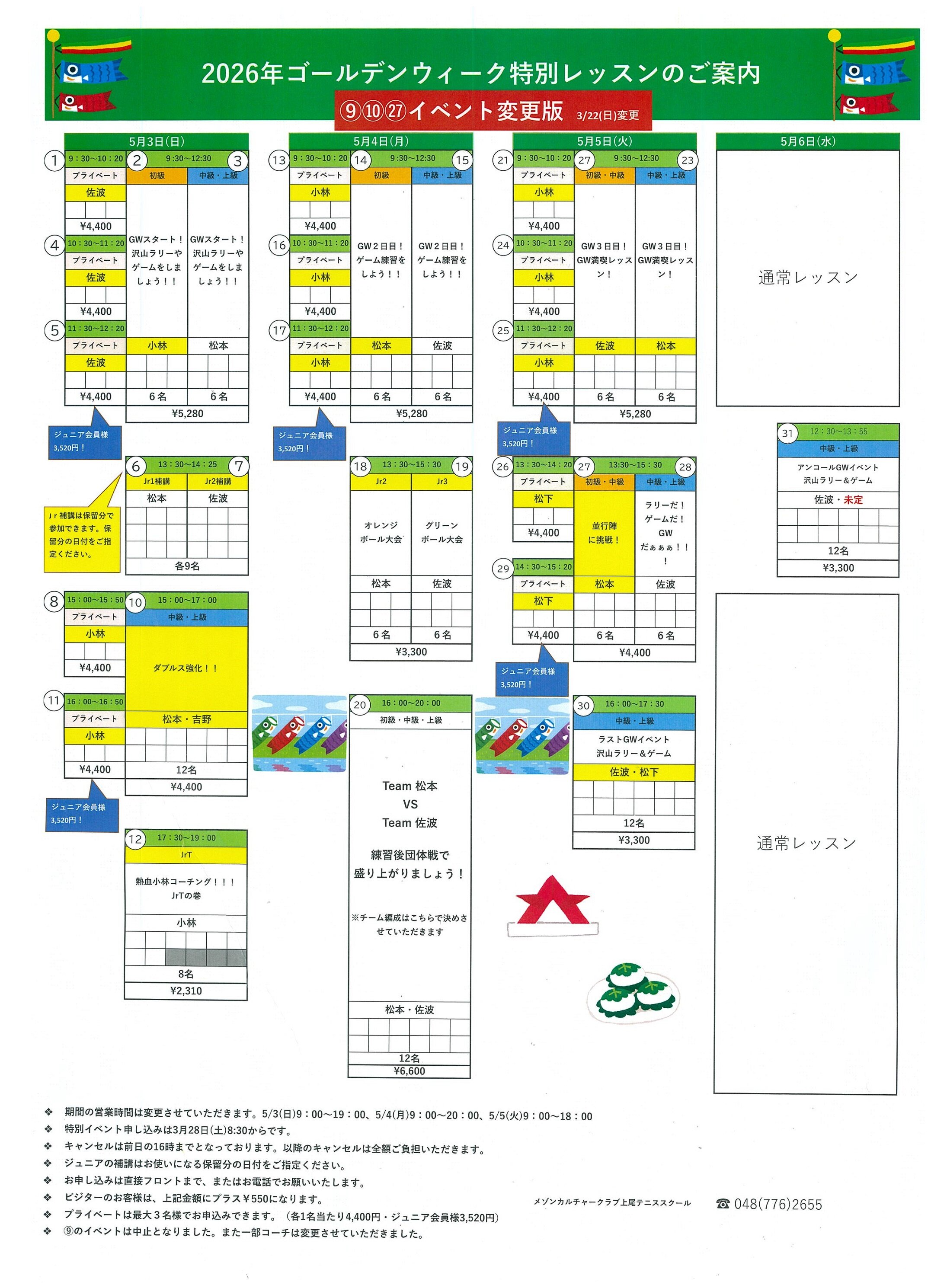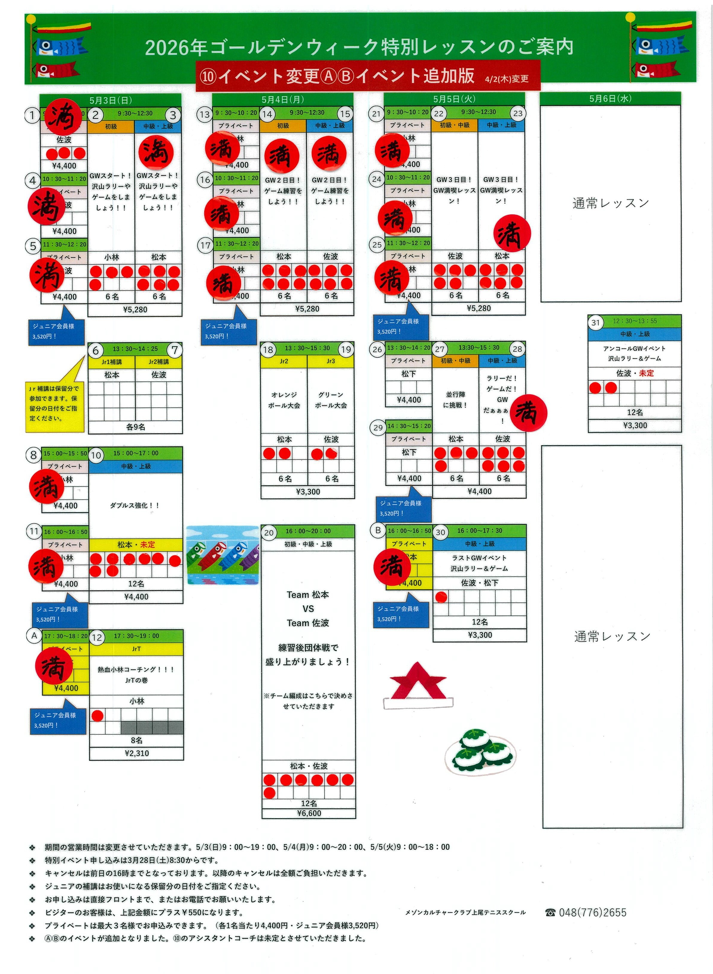 テニス2026年ゴールデンウィーク特別レッスンイベント修正と追加のお知らせ(4月2日更新)
