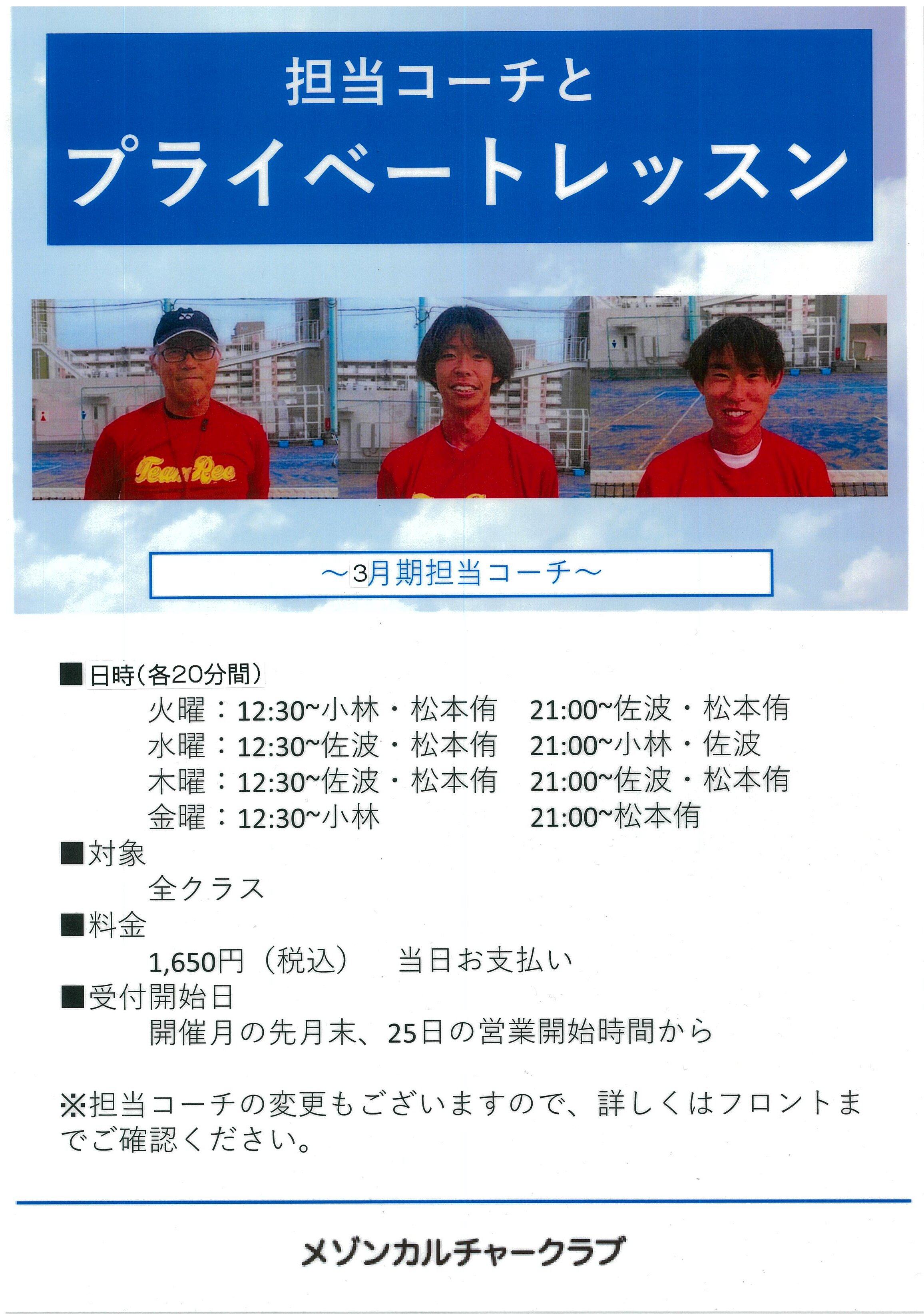 テニス3月期 コーチ担当表のご案内