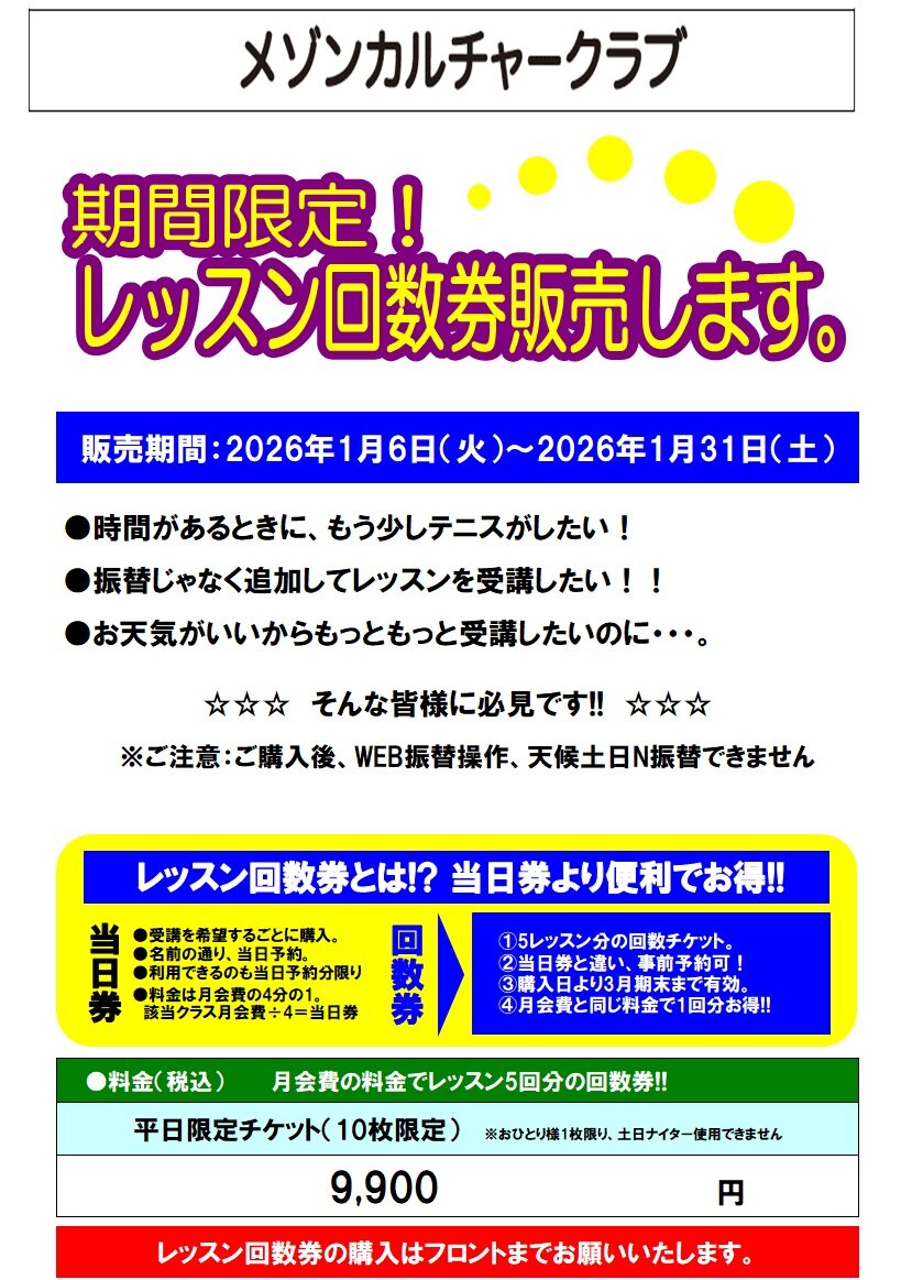 テニス レッスン回数券販売中!