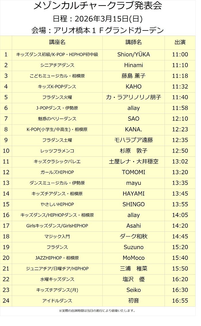 3/15(日)毎年恒例のメゾンカルチャークラブ発表会を開催いたします!こどもから大人までメゾンカルチャークラブ橋本の受講生をはじめ、相模原、伊勢原の受講生も参加し、練習の成果を発表いたします。皆さまお誘いあわせの上、ぜひご来場ください♪日時:3/15(日)11:00~17:10頃 場所:アリオ橋本1階 グランドガーデン観覧自由※最前列は出演中の方の関係者様優先です。 お席のお譲り合いにご協力をお願いいたします。
