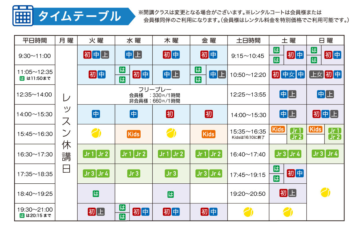 レッスンの可否判断は開講時刻の1時間前に決定します。(1時間目のレッスンは30分前決定です。)※急な雷雨の場合は、開講時刻直前にご案内をすることもございます。
