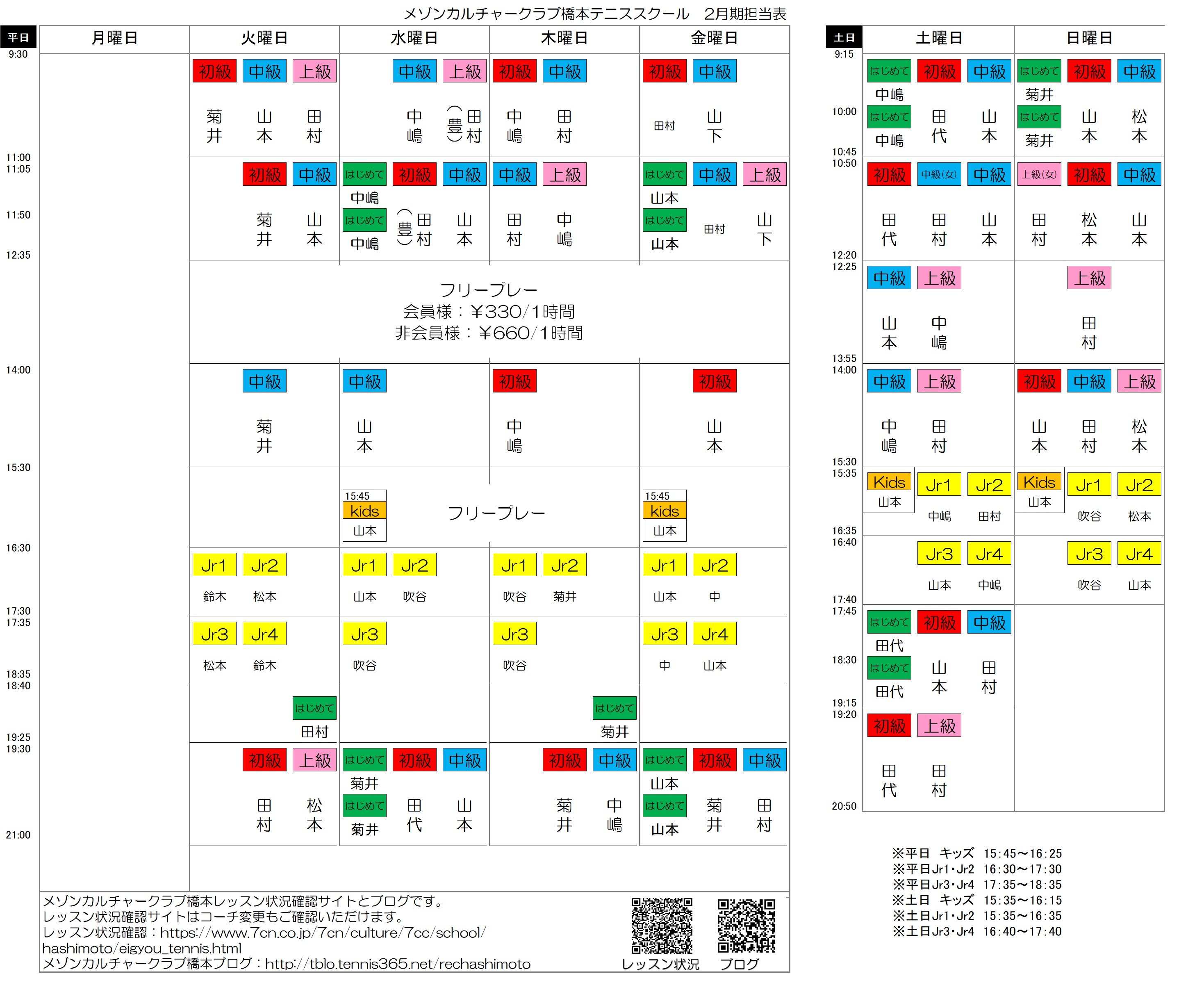 テニス2月コーチ担当表のご案内