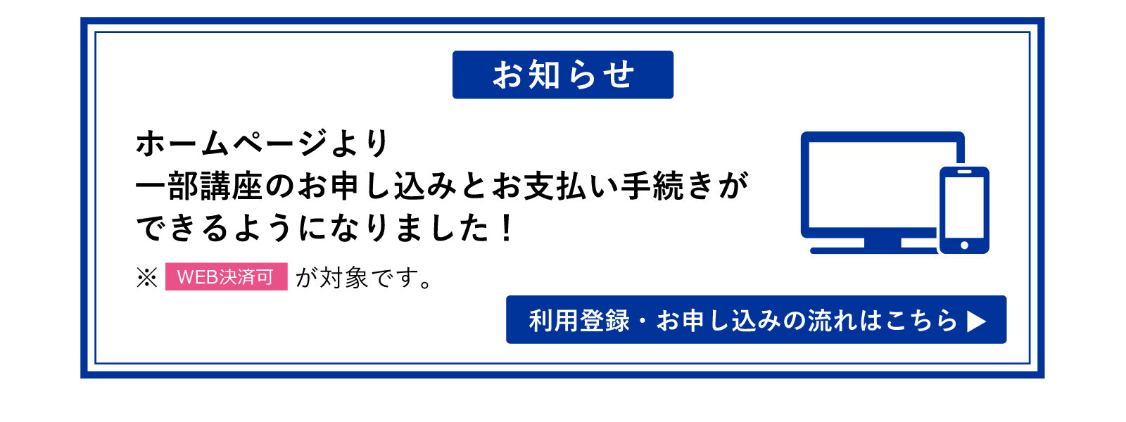 ご希望の講座ページの体験・入会申込ボタンよりお申し込みください。