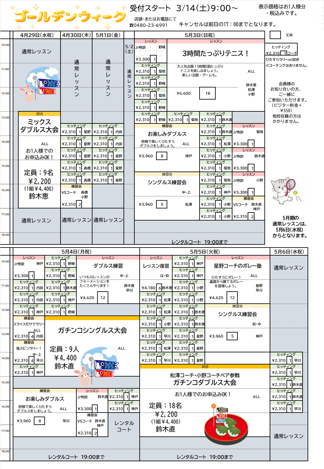 テニステニスクラス定員数変更のご案内