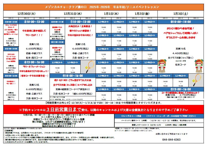 【テニス】年末年始特別レッスンのご案内