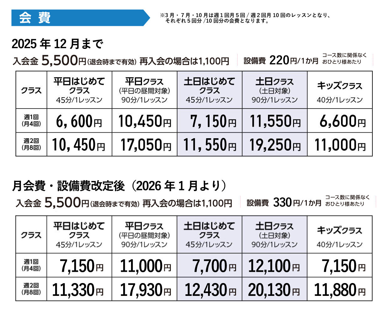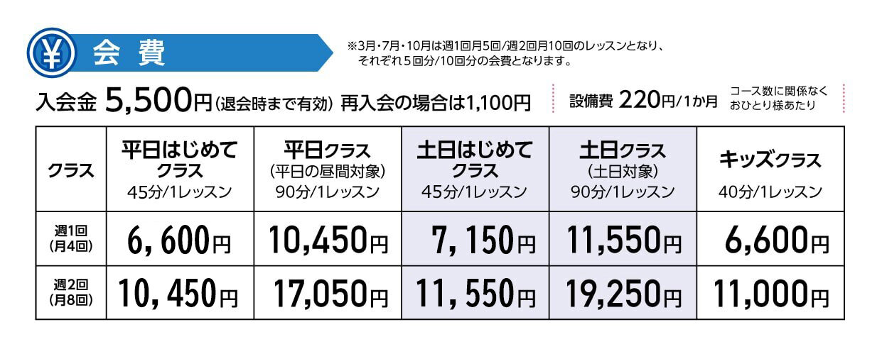レッスンの可否判断は開講時刻の1時間前に決定します。(1時間目のレッスンは30分前決定です。)※急な雷雨の場合は、開講時刻直前にご案内をすることもございます。
