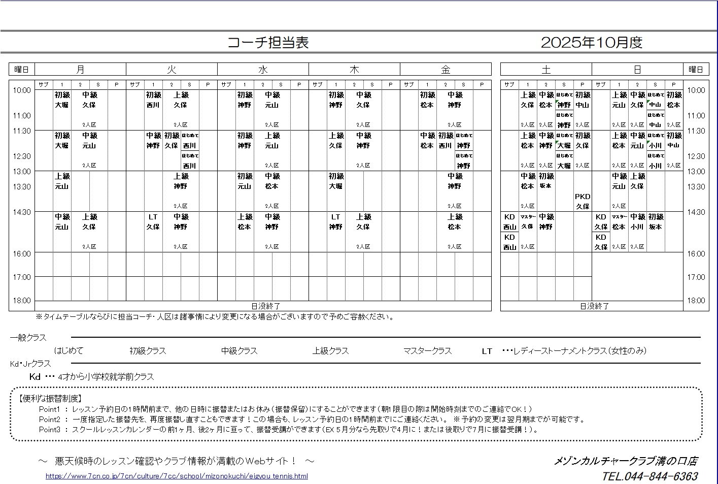 溝の口テニス4月度コーチ担当表