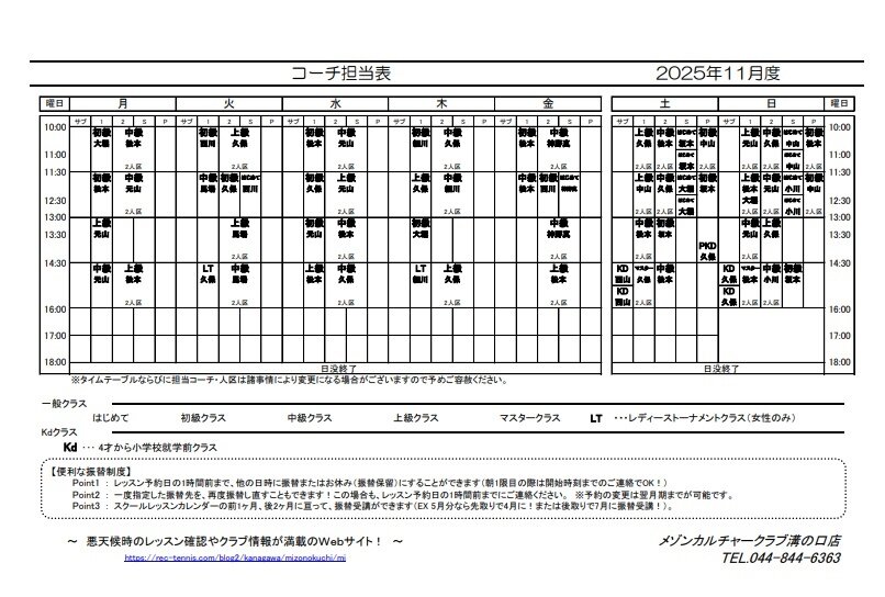 テニス溝の口テニス12月度コーチ担当表