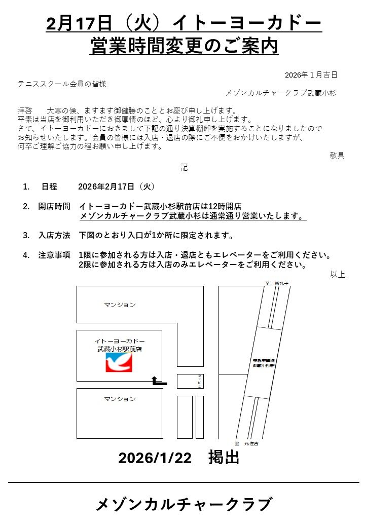2/17(火)イトーヨーカドー営業時間変更のご案内