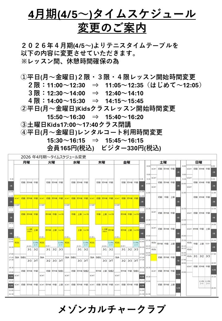 2026年4月期(4/5~)よりテニスタイムテーブルを