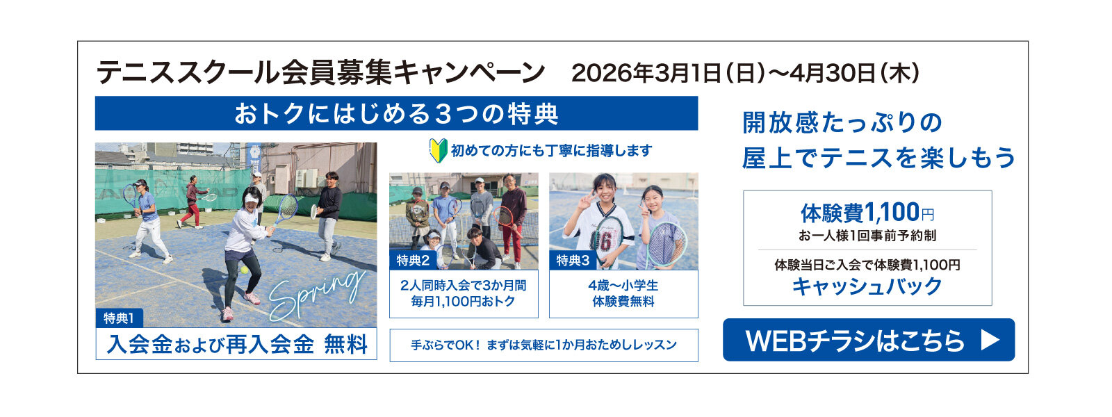 イトーヨーカドー・アリオの屋上にある、足腰にやさしい砂入り人工芝コートのテニススクールです。