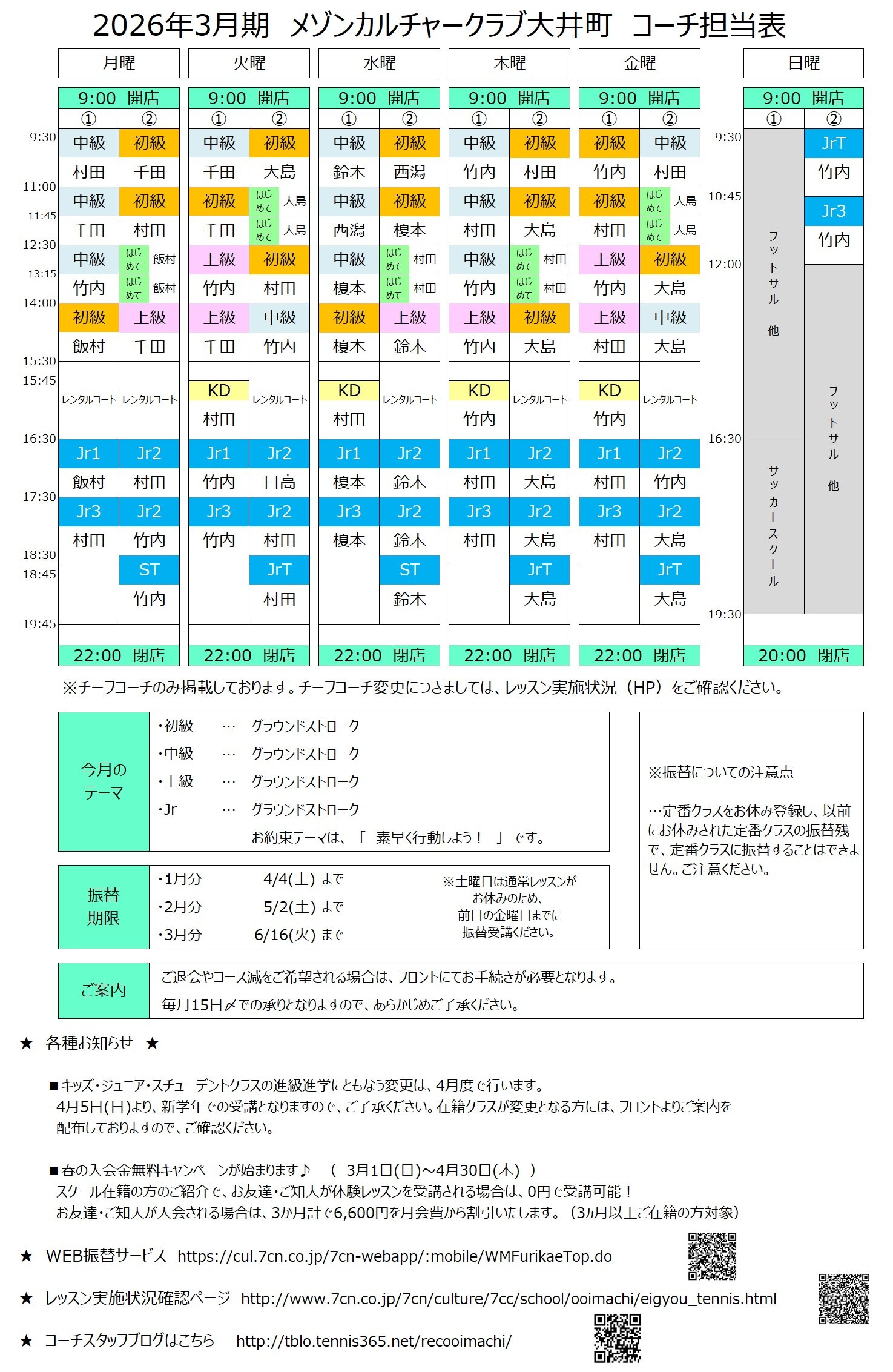 メゾンカルチャークラブ大井町 テニススクールコーチ担当表 (3月期 3/1-4/4)