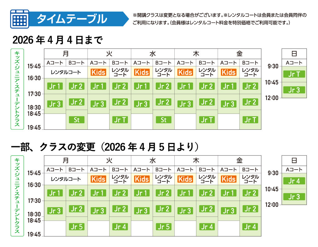 | Jr3 | 対象 | 3年生から6年生の進級クラス | レッスン内容 | 3~6年生の中級者が対象。 グリーン・イエローボールを使用し、フルコートで行います。 テニスのための身体の使い方をより高められるように練習しレベルアップします。 対象ジュニアテニス大会あり。 |