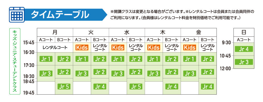 | Jr5 | 対象 | 小学3~6年生(中上級)、中学1~3年生(初中級) | レッスン内容 | イエローボールを使用し、フルコートで行います。 試合で勝つことを目標にして練習し、スクール内大会にも積極的に参加しています。 対象ジュニアテニス大会あり。 |