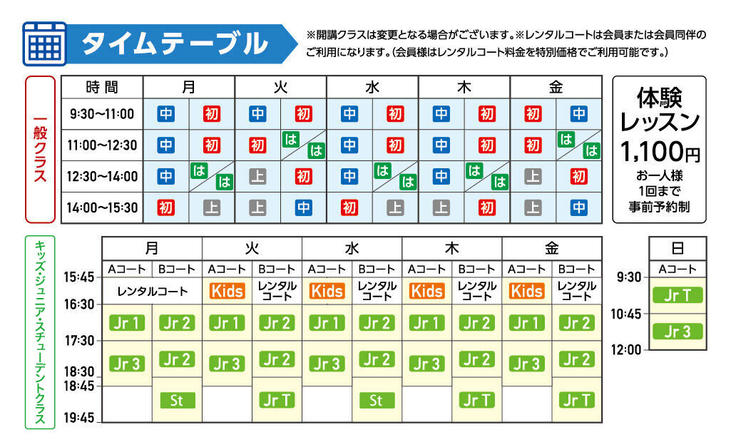 一般(大人)・ジュニア・キッズと豊富なタイムスケジュールからレッスンをお選びいただけます