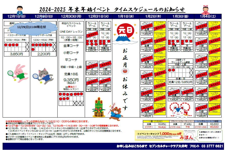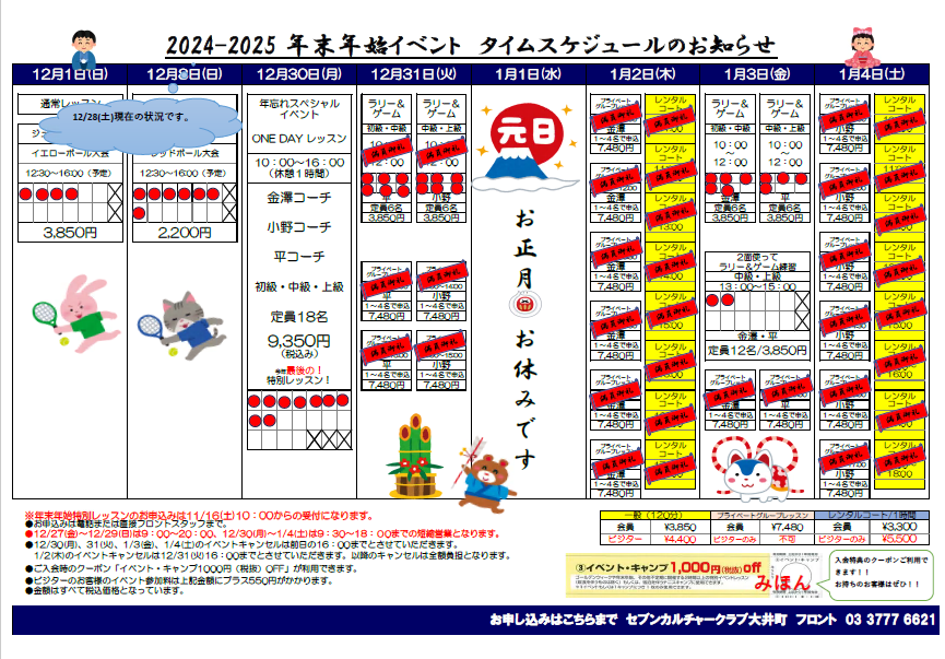 テニスメゾンカルチャークラブ大井町 テニススクールコーチ担当表 (12月期 12/2-12/29)