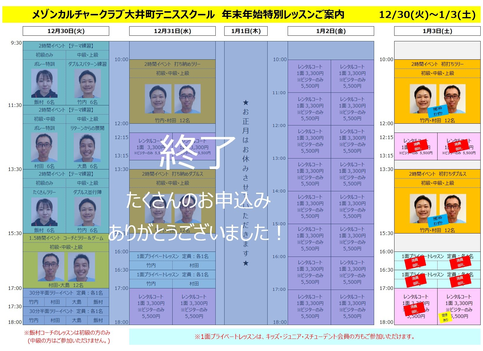 テニス年末年始イベント申込状況(12/31(水)16:30時点)