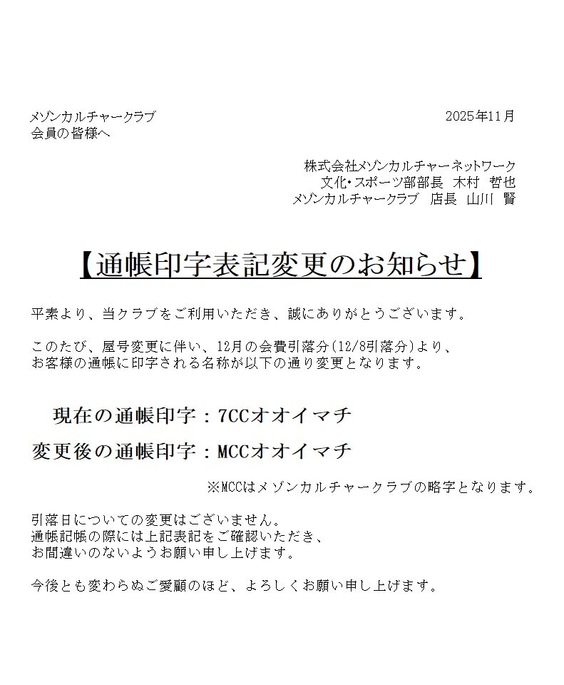 お知らせ会員の皆様へ 通帳印字表記変更のお知らせ