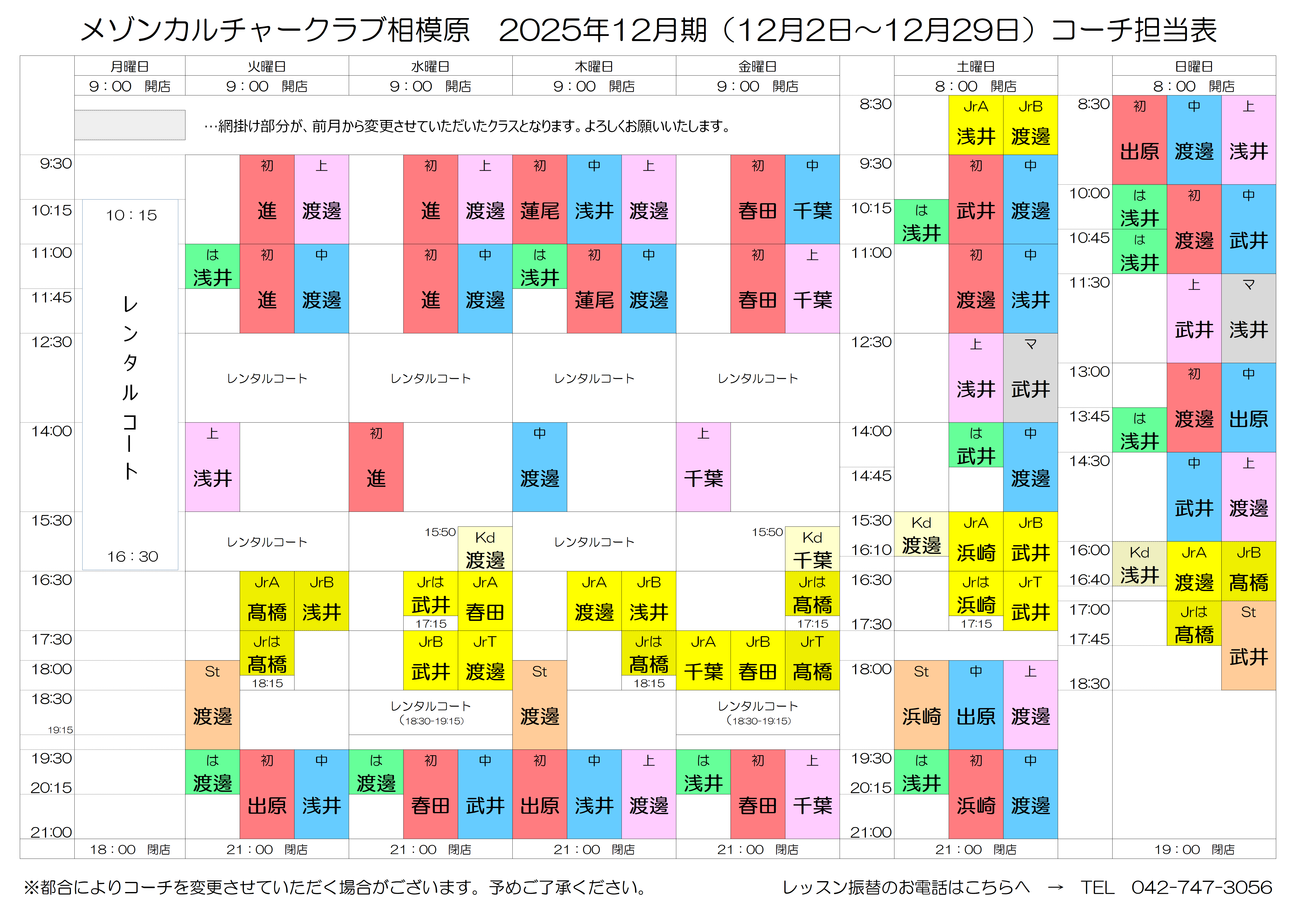 ♪2025年12月期 コーチ担当表♪