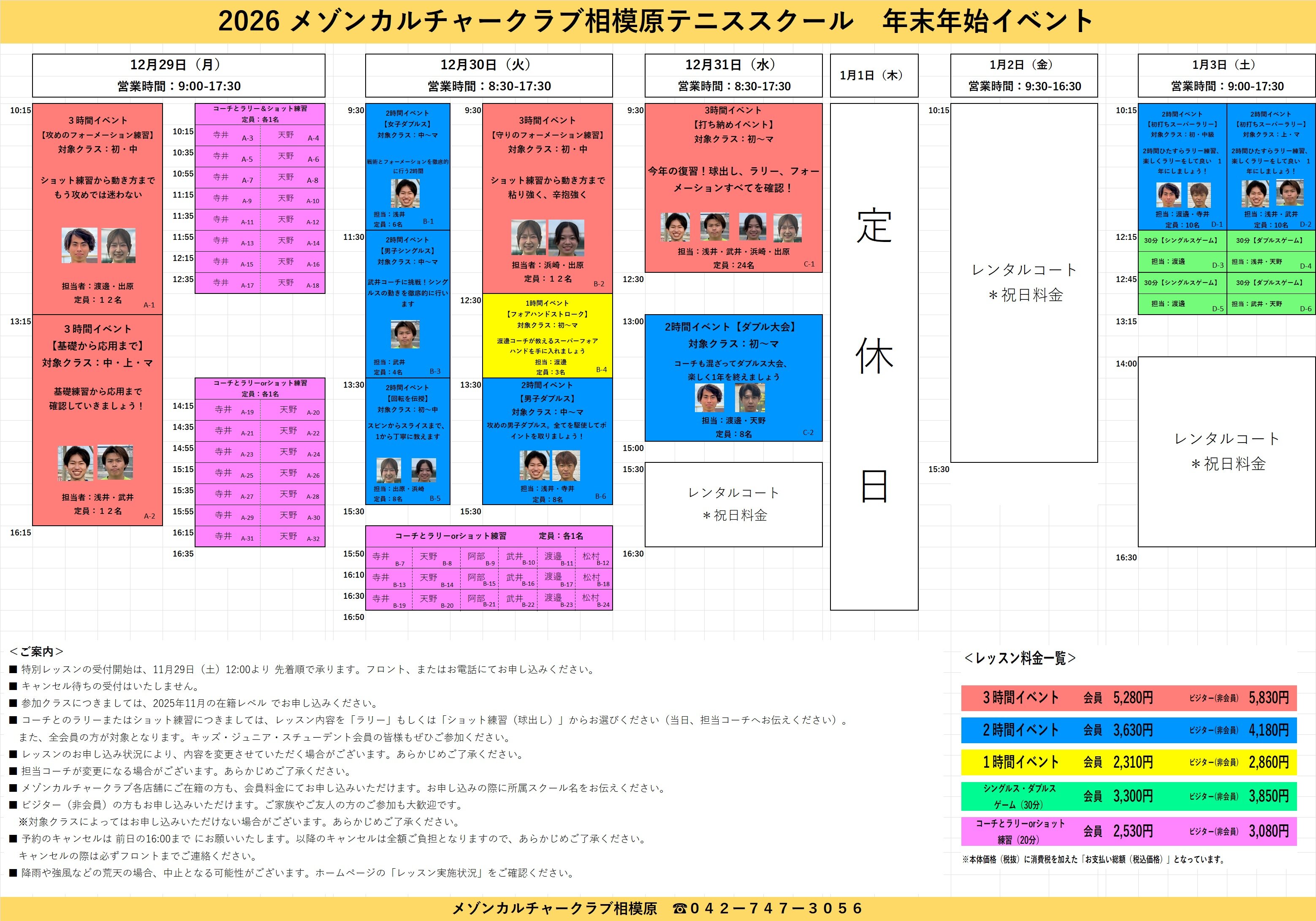 ■ レッスンのお申し込み状況により、内容を変更させていただく場合がございます。あらかじめご了承ください。
