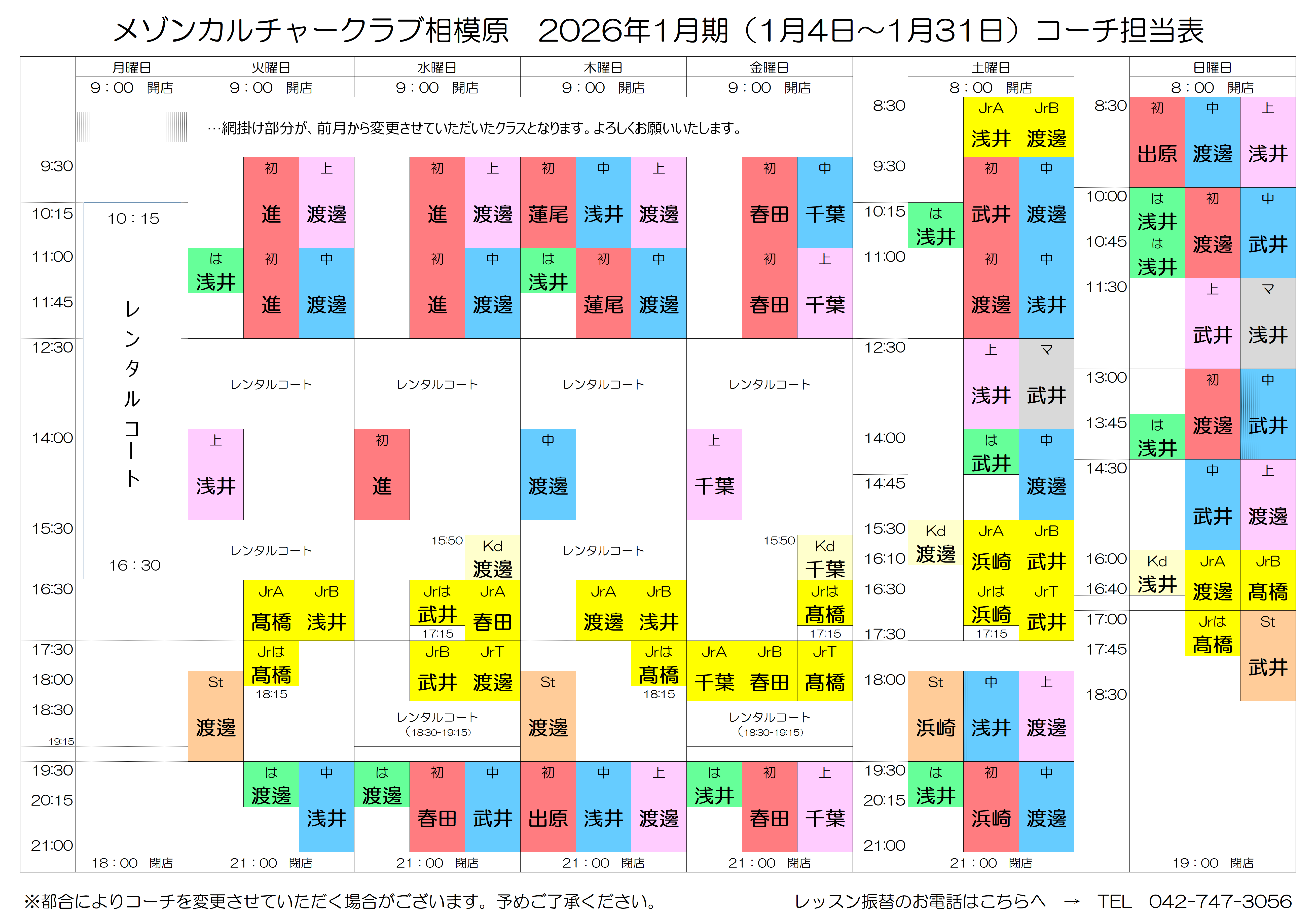 ♪2026年1月期 コーチ担当表♪