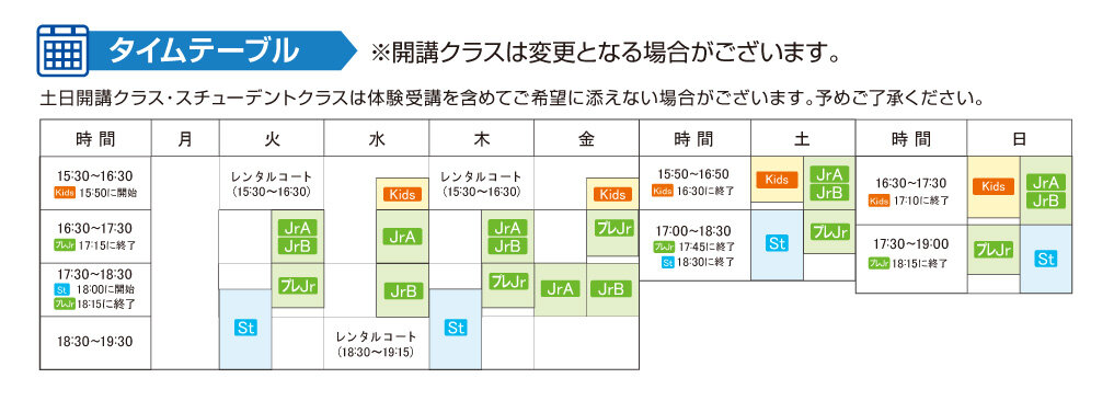 | JrB | 小学生全学年 | 基本フォームの習得を図ります。ラリーや試合を多くこなし、実践的な練習になります。 |