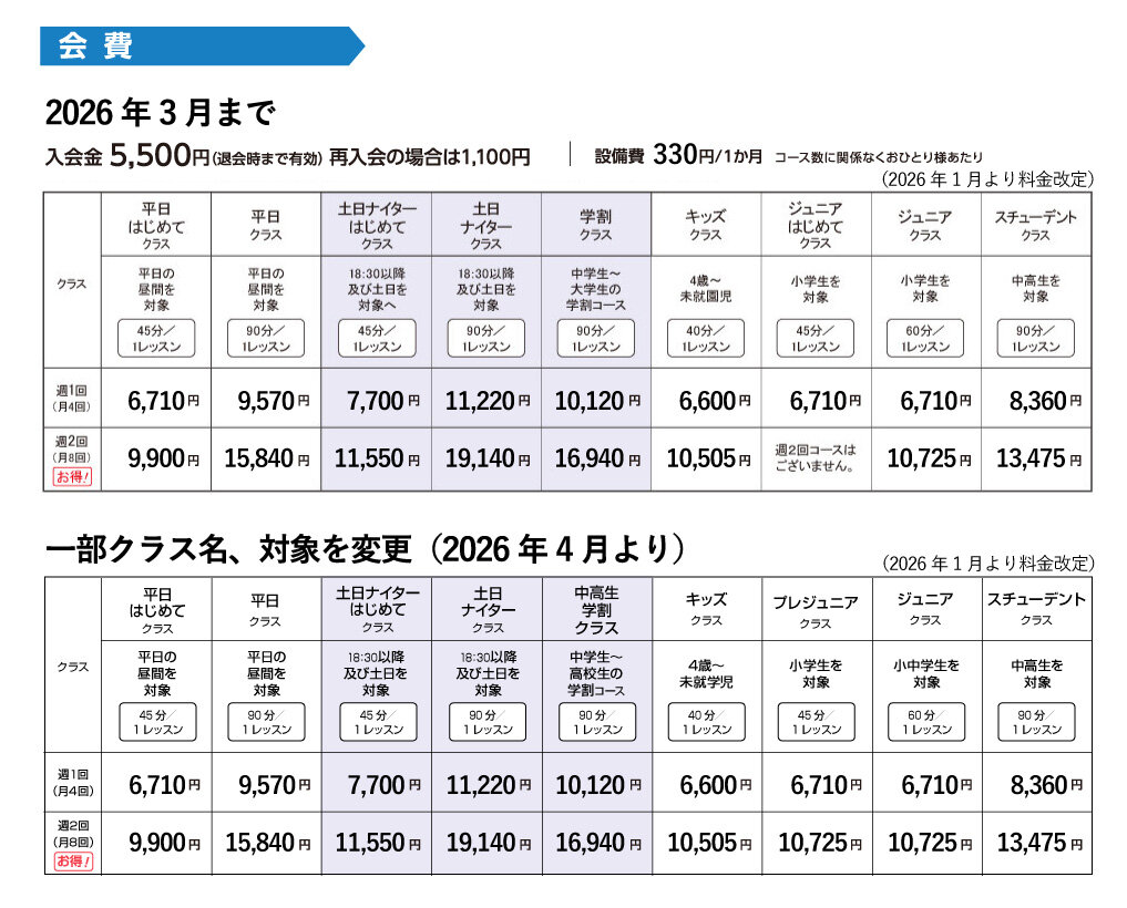 一般クラス・ジュニアクラスともにレベル分けとなっております。