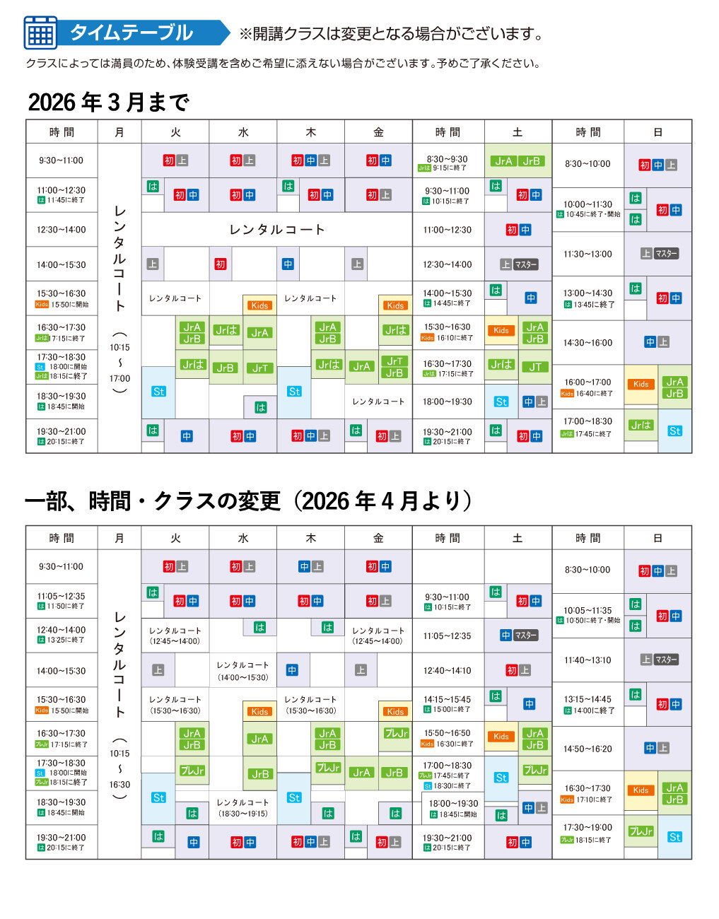 | JrB | 小学生全学年 基本フォームの習得を図ります。ラリーや試合を多くこなし、実践的な練習になります。 |