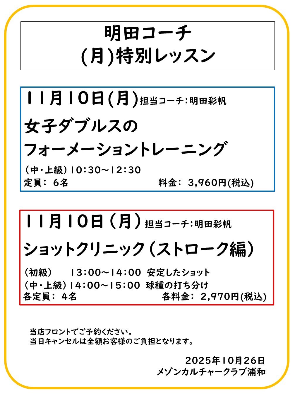 明田コーチ特別レッスンのご案内