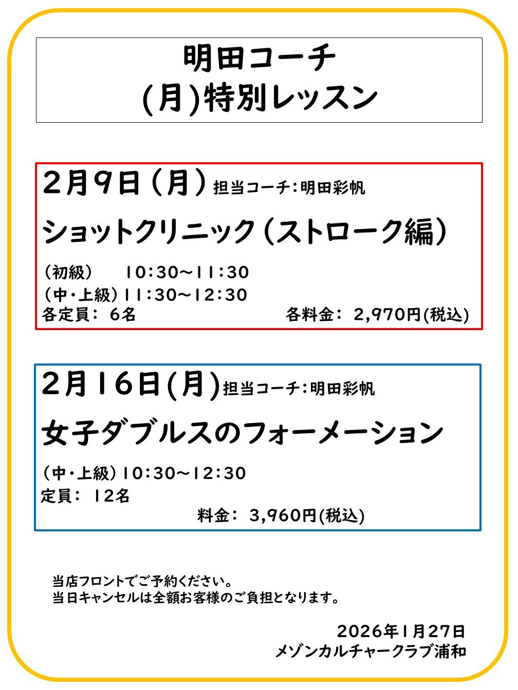 明田コーチ2月(月)特別レッスン