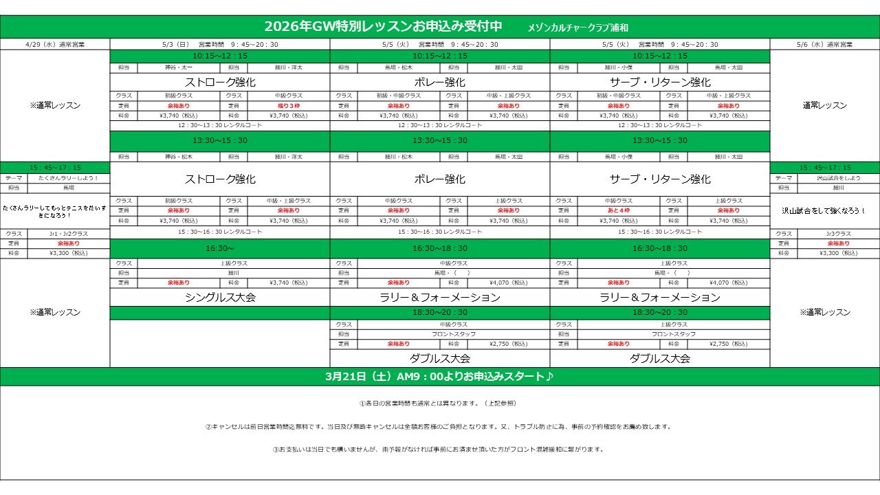 5/3(月)~5/5(火)ゴールデンウィーク特別レッスンはただいま受付中!