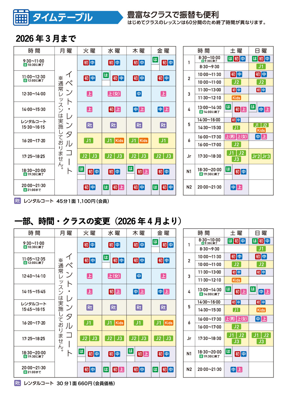 | Jr2 | 小学校4~6年生対象の基本から簡単なラリーを行うレッスン です。 |