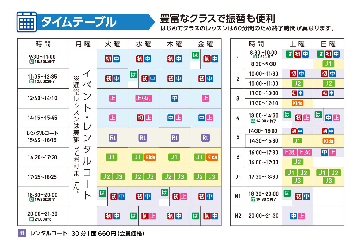自分のレベルをクラス案内から探し、タイムテーブルから曜日・時間を決めたら電話またはホームページからご予約を。ラケット・シューズは無料でレンタルいたします。