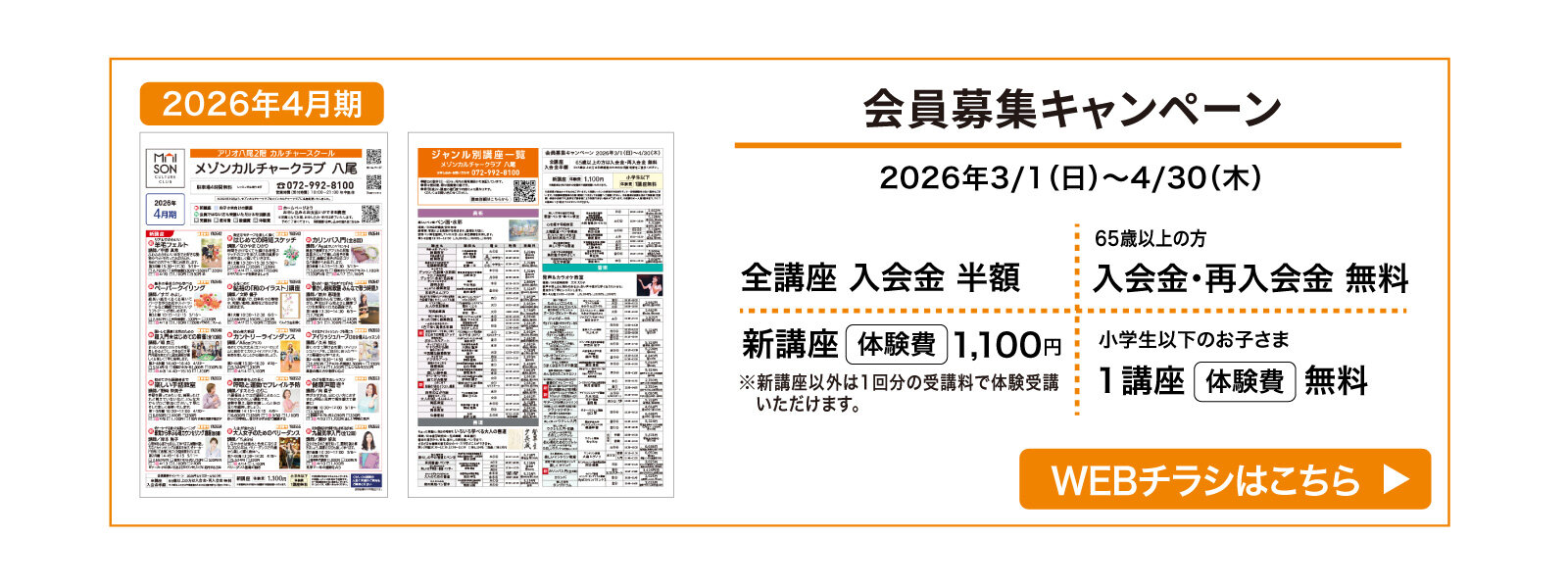 会員募集キャンペーン【3/1~4/30】小学生以下のお子さま 1講座体験費無料
