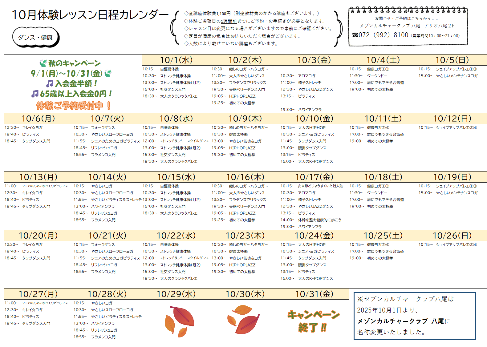 2025年10月【ダンス・健康】体験レッスン日程カレンダー