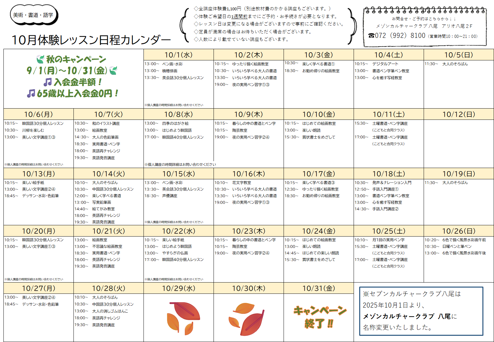 2025年10月【美術 書道 語学】体験レッスン日程カレンダー
