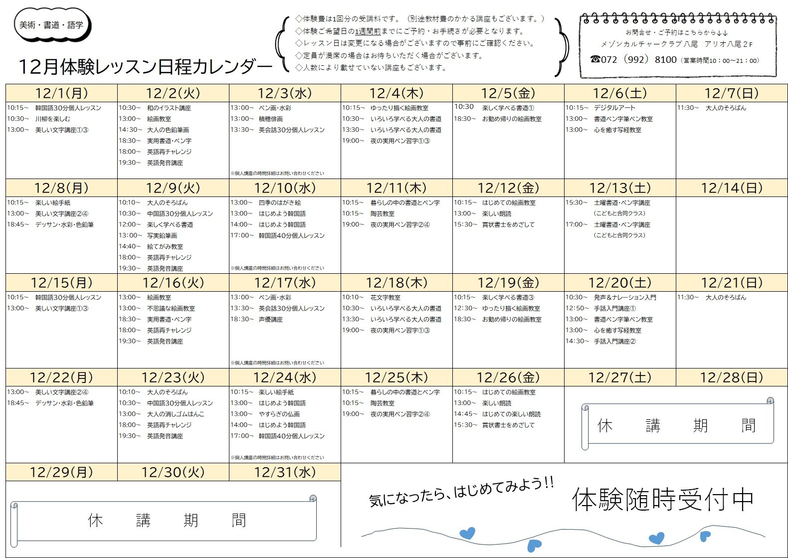 2025年12月【美術 書道 語学】体験レッスン日程カレンダー