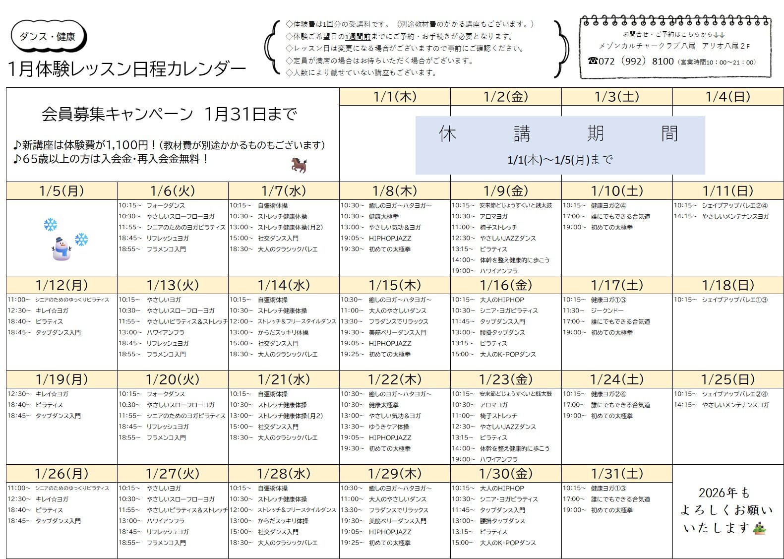 2026年1月【ダンス・健康】体験レッスン日程カレンダー
