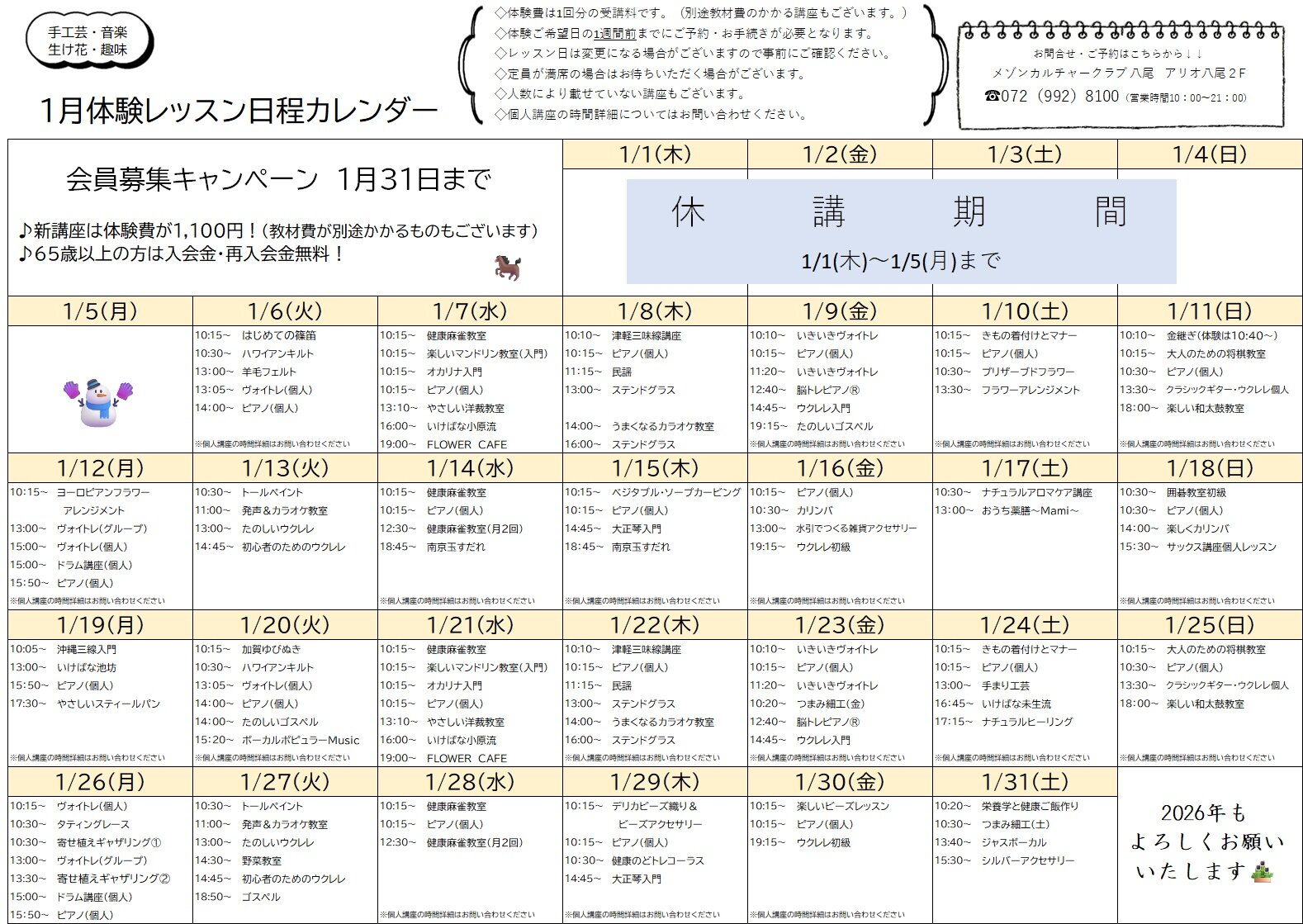 2026年1月【手工芸 音楽 生け花 趣味】体験レッスン日程カレンダー