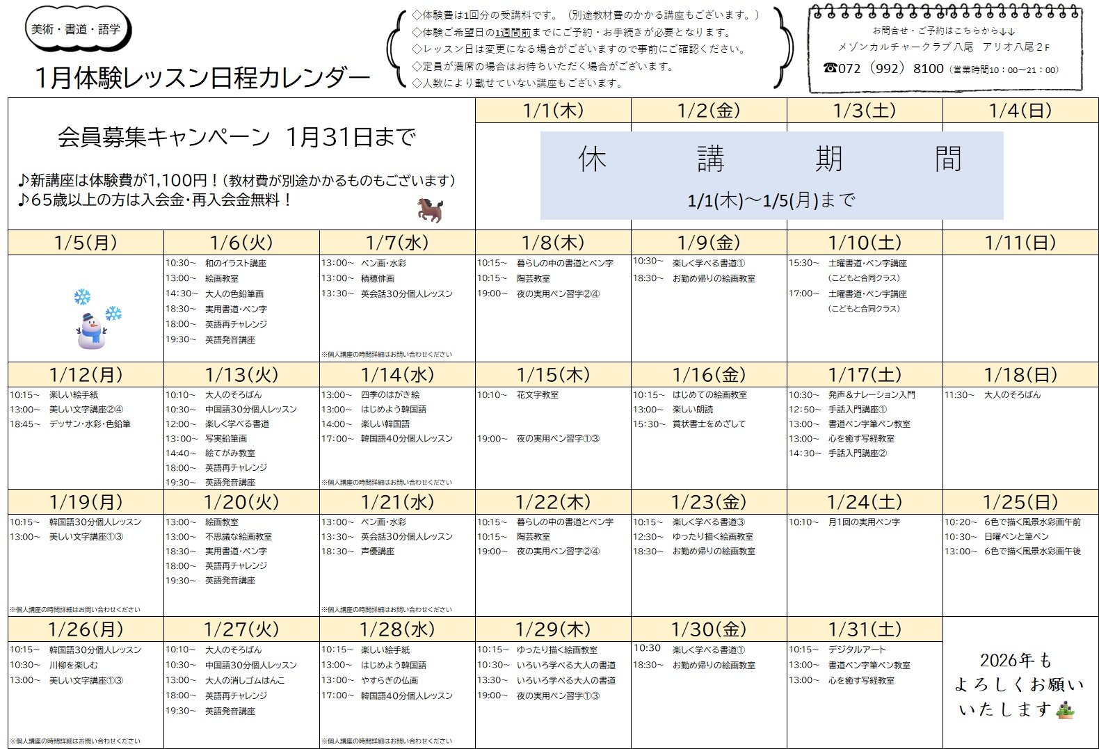 2026年1月【美術 書道 語学】体験レッスン日程カレンダー