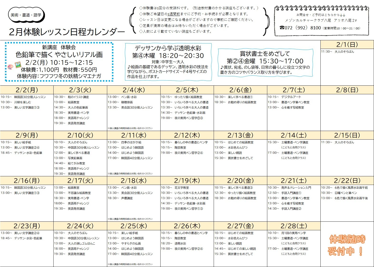 2026年2月【美術 書道 語学】体験レッスン日程カレンダー