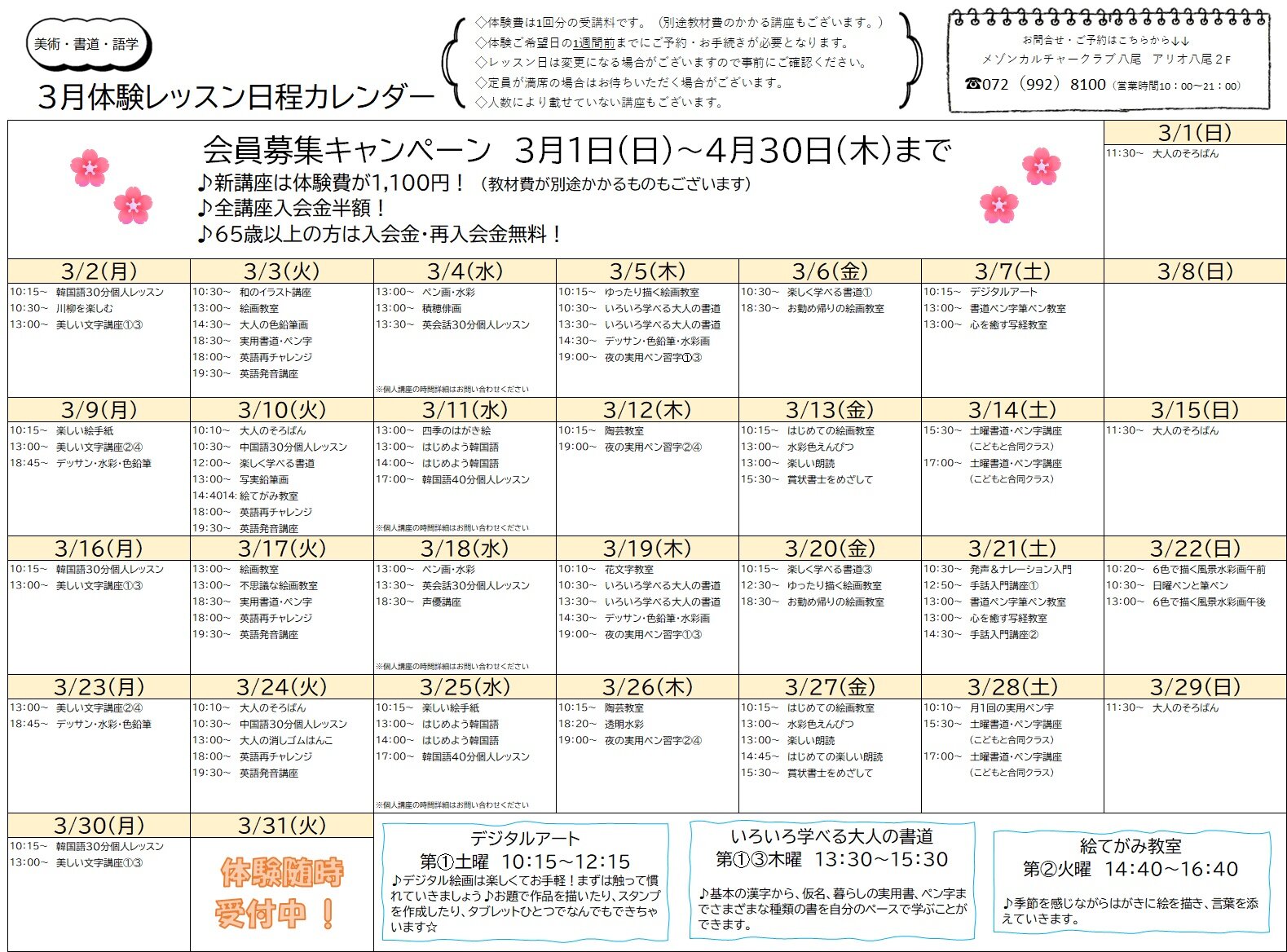 2026年3月【美術 書道 語学】体験レッスン日程カレンダー