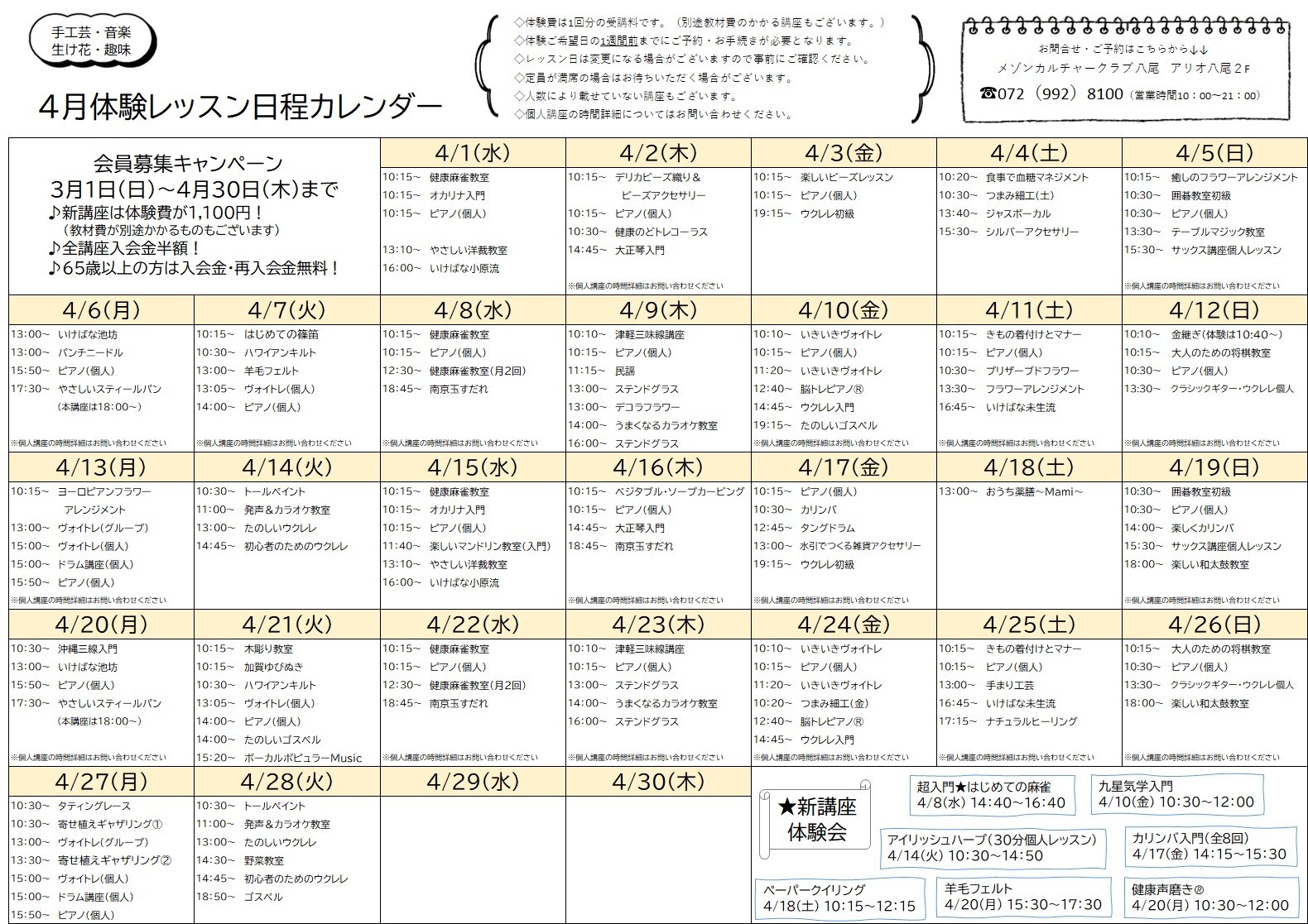 2026年4月【手工芸 音楽 生け花 趣味】体験レッスン日程カレンダー