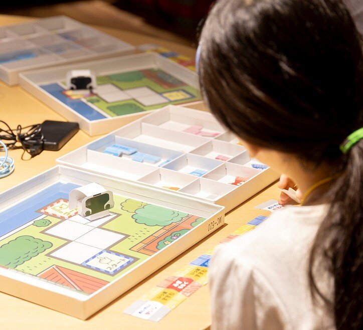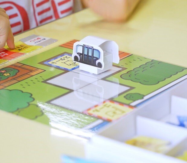 自動運転モビリティに見立てたロボットトイを動かす体験で、プログラミング的思考を楽しみながら身につけられます。