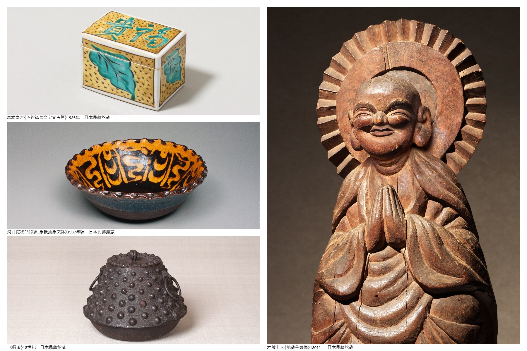 「民藝」という言葉が誕生するきっかけとなった木喰仏をはじめ、上加茂民藝協団で活動した黒田辰秋、青田五良の作品や、「民藝館」「三國荘」のために制作された河井寬次郎、濱田庄司、バーナード・リーチらの工芸作品、柳宗悦らによる日本全国の蒐集品や、芹沢銈介、棟方志功などの民藝関連作家の優品を展示します。